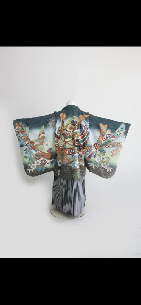 緑の地色が綺麗な兜と熨斗目模様の華やかな羽織になります。